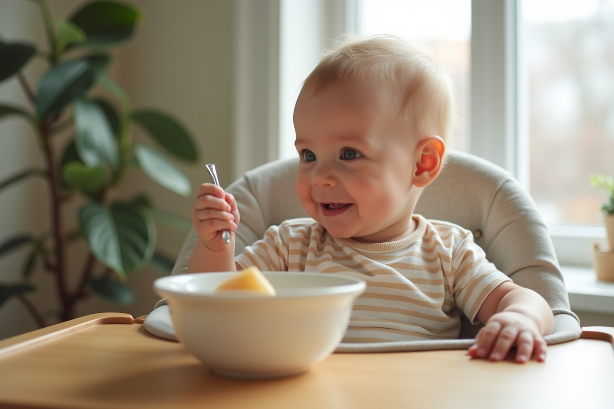 Vers 9 à 12 mois, le bébé montre un intérêt croissant pour l’alimentation autonome. Encouragez-le à utiliser ses doigts pour manger des morceaux de fruits, de légumes cuits et de pain. À cet âge, la mastication et la coordination main-bouche sont suffisamment développées pour permettre cette progression.